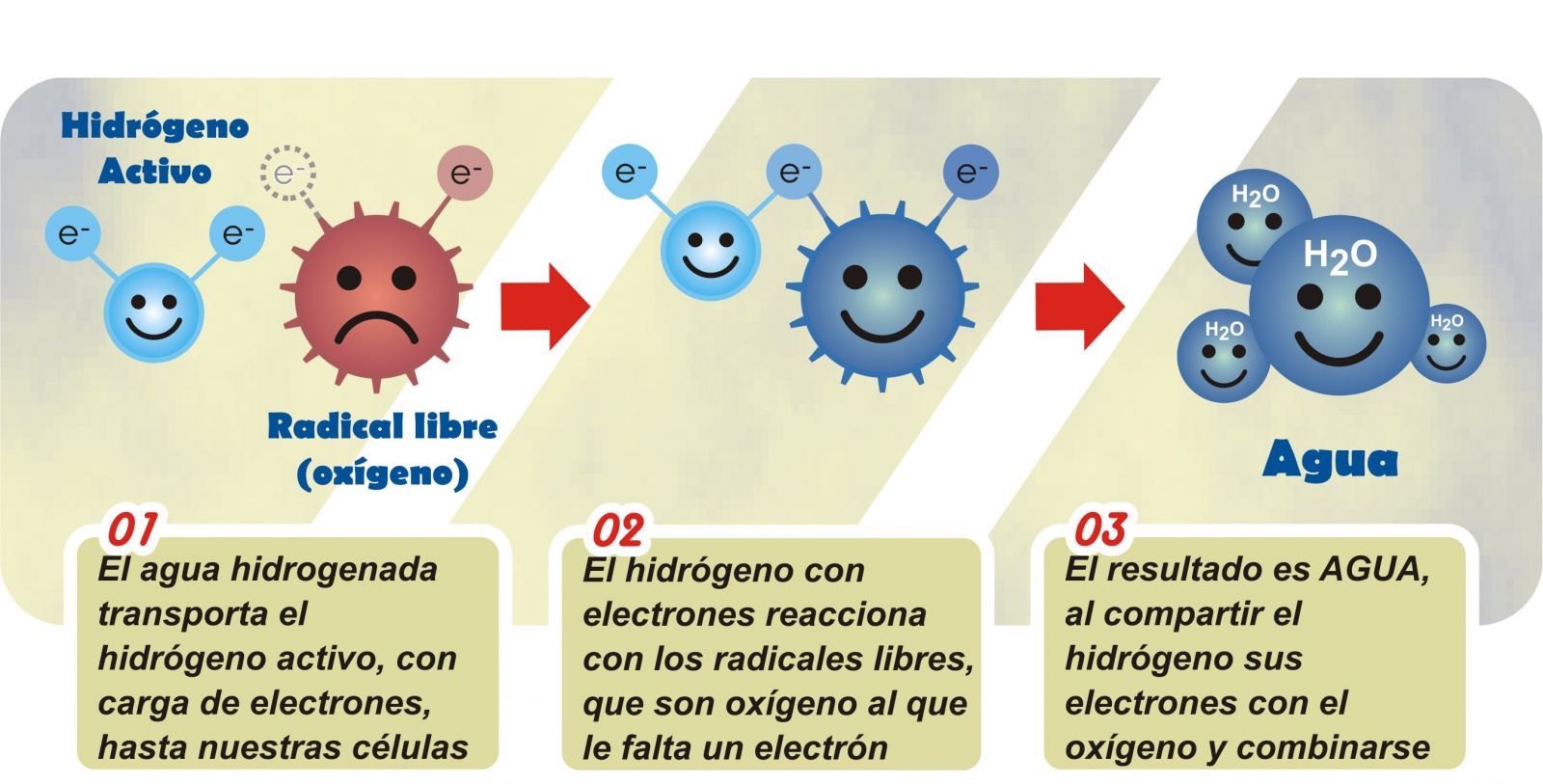 Hidrozono® inyecta electrones al agua, al inyectarle hidrógeno, aportándole carga eléctrica antioxidante. El agua enriquecida con hidrógeno dona sus electrones y neutraliza los radicales libres.