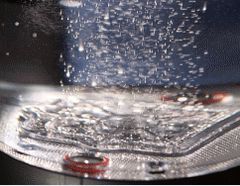 1.- En la cubeta inferior se separa el hidrógeno del oxígeno por medio electrólisis, por la acción de los electrodos, que son dos rejillas de titanio con baño de platino, una conectada al polo positivo en contacto con el agua de la cubeta inferior, y la otra conectada al polo negativo en contacto con el agua de arriba, en la base de la jarra.